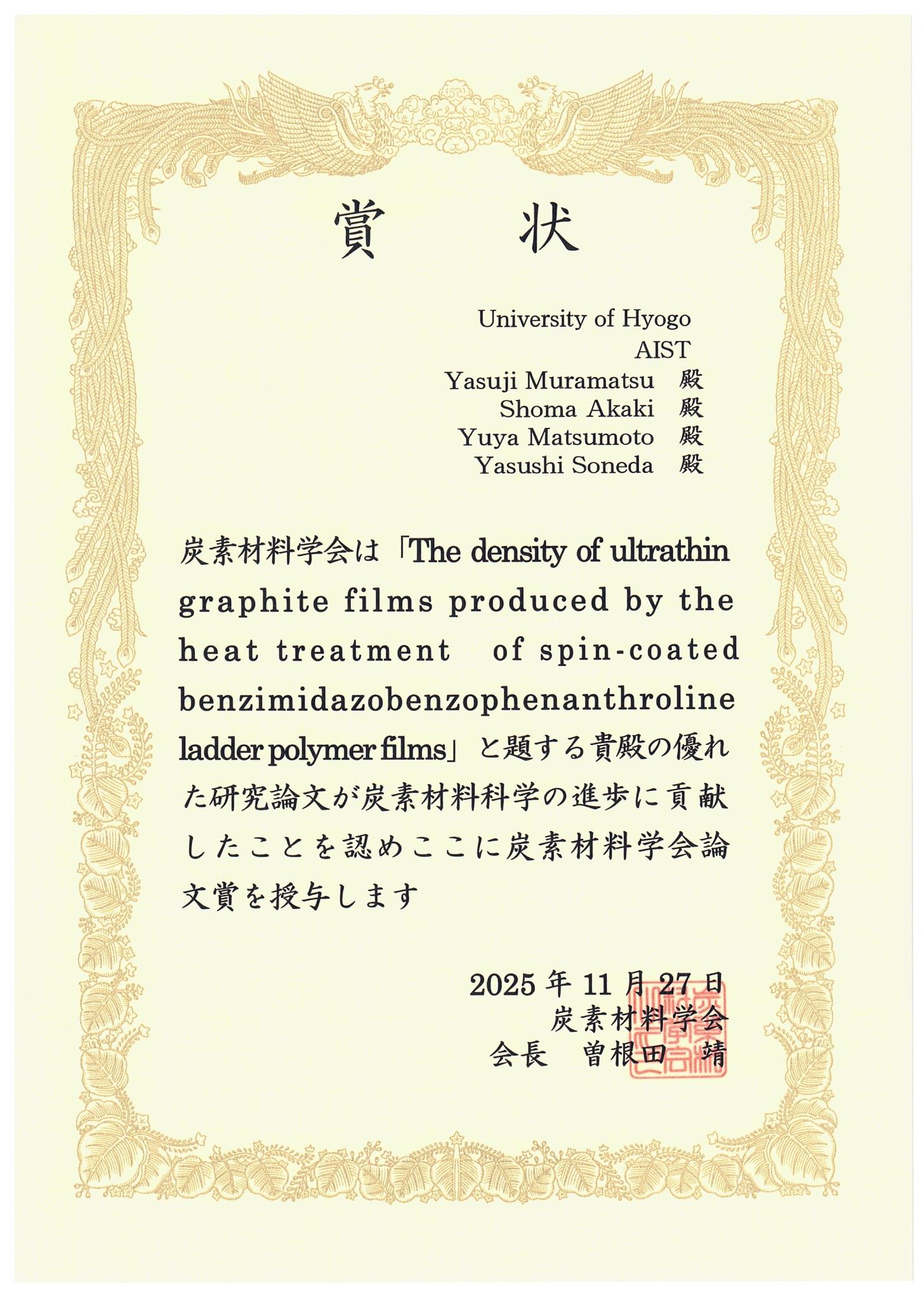 工学研究科・高度研の村松康司特任教授らが,第52回炭素材料学会年会(2025年11月26~28日,長野市)において,炭素材料学会論文賞を受賞しました。受賞論文のタイトルは”The density of ultrathin graphite films produced by the heat treatment of spin-coated benzimidazobenzophenanthroline ladder polymer films”で,Carbon Reports, 4, 234-239 (2025)に掲載されました。共著者は応用化学専攻博士前期課程を修了した赤木翔眞さんと松本侑也さん,並びに産総研エネルギープロセス研究部門総括研究主幹の曾根田靖博士です。本論文はグラファイト超薄膜の密度が膜構造の乱れに強く依存することを示し,この結果から炭素原子のX線質量吸収係数を正確に実験で決定することが可能となりました。これは炭素材料分野と放射光分野の異分野融合による重要な研究成果の創出です。